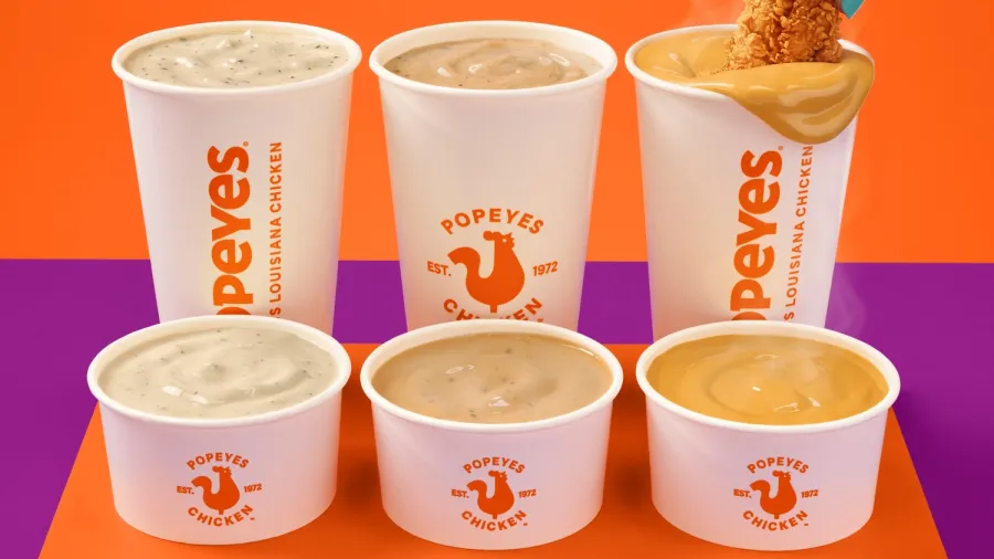 Popeyes UK is rolling out oversized versions of its sauces, launching new “Mega Dip” and “Big Dip” options for Ranch, Kickback, and Cheese.
